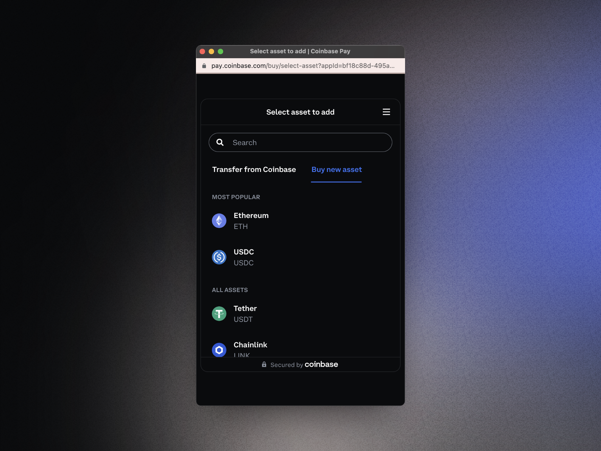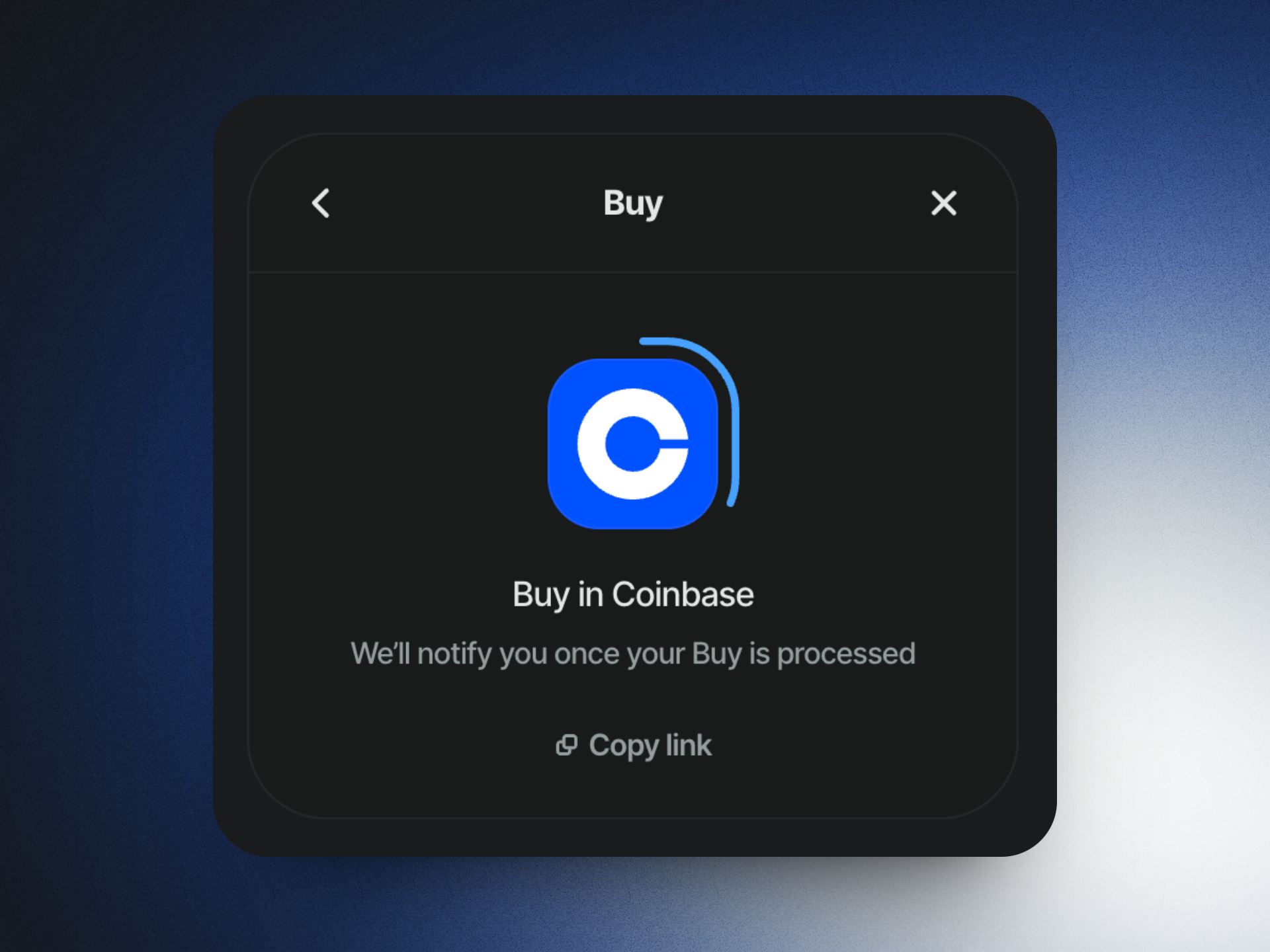 Complete your purchase using your selected provider. You will be prompted to sign in to your Coinbase or Meld account. If the payment page does not appear, you can copy link from the wallet modal and paste it in your browser.