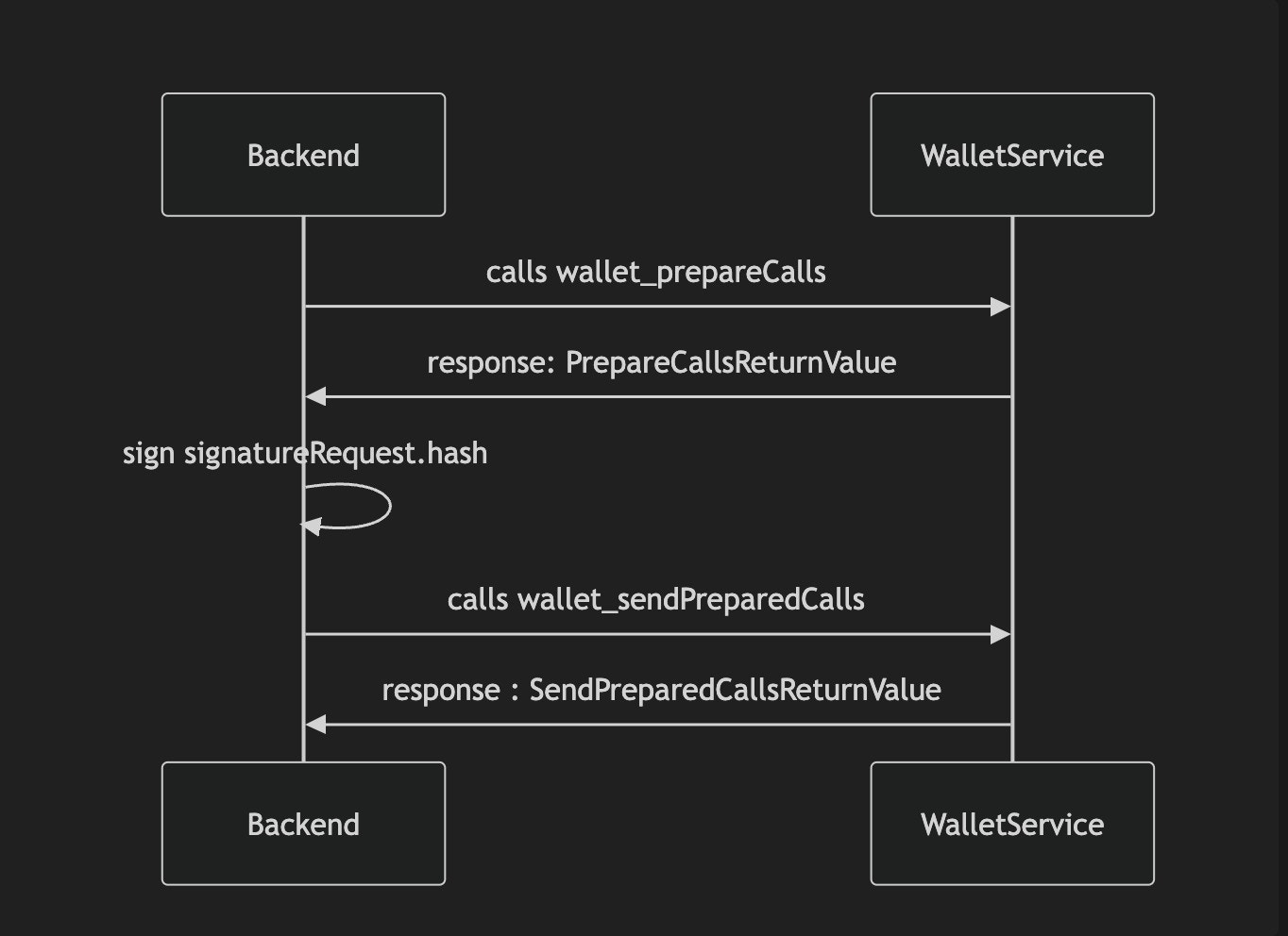 wallet_sendPreparedCallsJSON RPC call. The RPC accepts the prepared response fromwallet_prepareCallsrequest along with a signature, and returns an EIP-5792 call bundle ID.