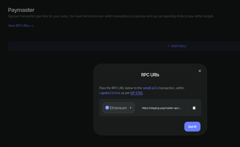 Each Paymaster is linked to a specific chain. Click the “RPC URLs” button to view all supported chain URLs.